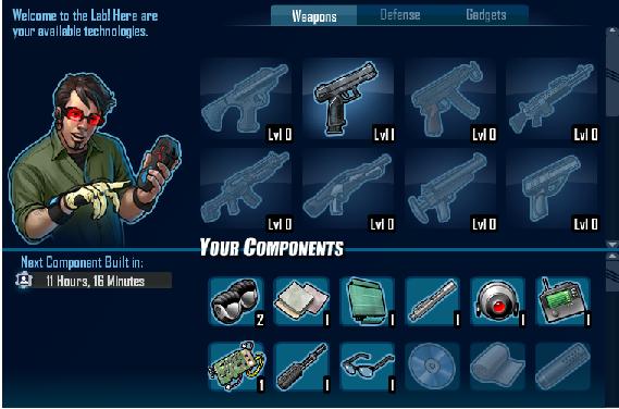 There is also a crafting aspect to the game, and one can even farm mats if they so desire. Some missions have the chance to “drop” a component – perhaps a weapon or armor piece or some kind of gadget. Components can be taken to the lab technician who has 40+ different items he can make for you if you acquire the necessary ingredients. These items are either weapons, armor, or gadgets which help you do your job. Components are also acquired from him once every 12 hours if you check-in, and from visiting new friends who play the game.