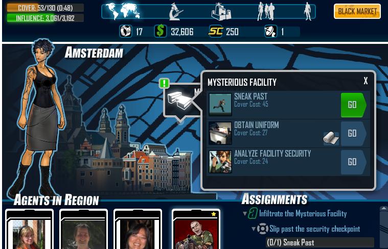 The game itself is rather basic and many of its features would be familiar to anyone who has played other social games on facebook. It has the familiar line of friends at the bottom whom you can visit each day to help out for a small Influence (xp) bonus. Also, the basic mechanic that allows one to complete actions in the game will be familiar to many app users. It works off a kind of energy bar system which is depleted by a certain amount on completing an action and is restored as time passes. I was happy to see that the restoration pace is actually quite swift compared in particular to Zynga’s new Treasure Isle treasure-hunting game. There is also the typical personal decoration part of a Facebook game. Here, you have an HQ that you can decorate and organize as you wish as well as an avatar you can dress and equip as you choose. These two staples of Facebook games are present in the Agency but take a backseat to the actual gameplay. I realize this may be a problematic statement as decoration and personalization are certainly forms of gameplay. In the Agency, however, there is an obvious difference between more traditional forms of gameplay (like questing) and those more associated with social games.