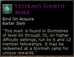 This play-for-currency system has been in place since the last expansion Siege of Mirkwood when the skirmish system was released. A player can instantly enter into a scripted instance, typically only about 20 minutes long, with friends or alone, and acquire Skirmish Marks of varying levels depending on difficulty and size. The Marks can then be bartered with a vendor for a myriad of items, both cosmetic and combat.