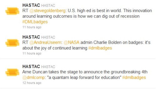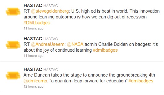 This morning, the 4th annual Digital Media & Learning Competition was announced on the theme of “Badges for Lifelong Learning”. Around 10:15am or so, Twitter started erupting in very odd comments tagged with #dmlbadges from HASTAC’s live feed.