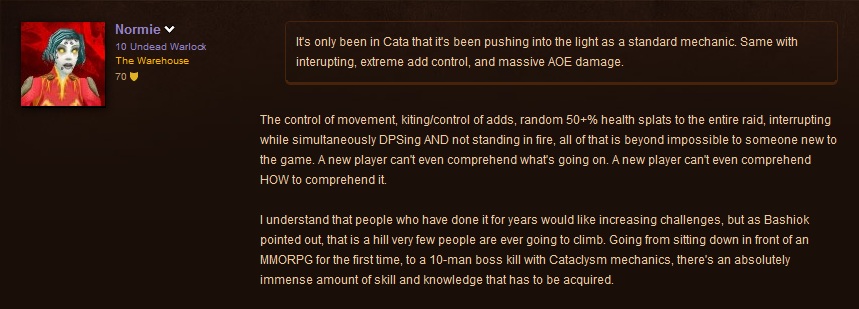 Players often come to World of Warcraft new to the genre, perhaps even new to video games. They don’t understand how to parse the UI, let alone busy boss mechanics. The hope is that they “learn their class” through the leveling process and as they complete 5-man dungeons. However, much of the content has been simplified to account for the age of the game and the relative age of its playerbase. Even new players without veteran perks experience easy versions of 5-mans due to their companions who are, for the most part, overly geared and skilled alts.