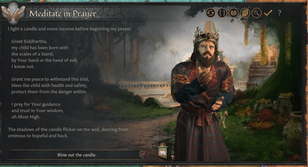 I have been working on a little event mod for CK3 for awhile now, and I’m nearing the end. My goal has primarily been to get comfortable with event scripting and practice a little bit of writing.