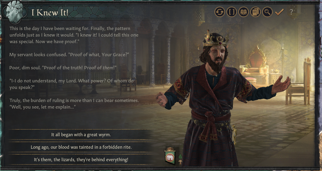 There are however numerous stories of paranoid rulers – Basil I is one I know well, but one more commonly known is King Charles VI. This event chain is modeled on these kinds of individuals who, whether because of head injuries, mental illness, or incest a core personality trait, come to see the world differently than it is.